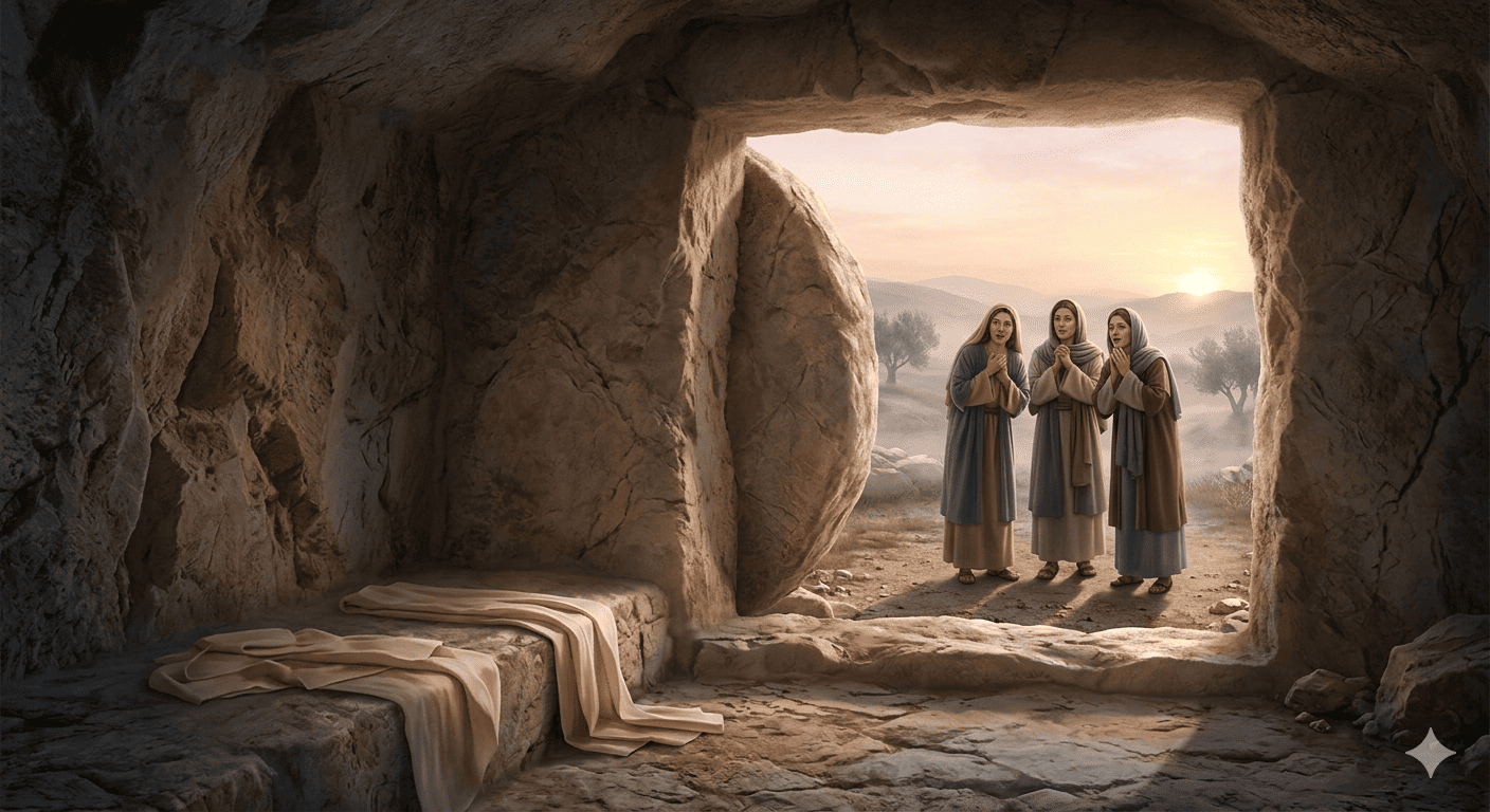 Para perempuan datang ke kubur dengan hati penuh duka. Namun mereka menemukan kubur kosong. Malaikat berkata: Ia tidak ada di sini, sebab Ia telah bangkit.” Ketakutan mereka berubah menjadi sukacita. Firman ini menunjukkan bahwa Tuhan mampu mengubah duka menjadi sukacita dan kematian menjadi kehidupan (Mat 28:1-10).