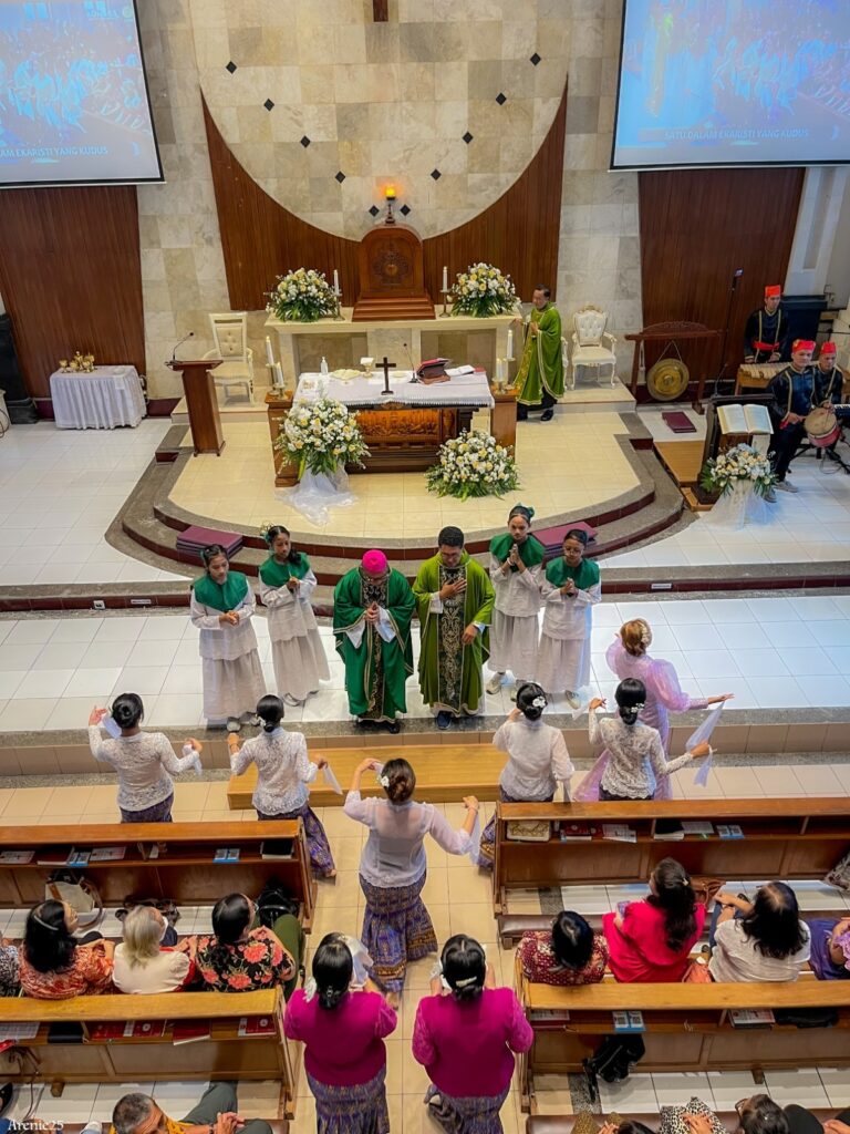 Para penari dengan busana daerah khas Minahasa, menarikan Tarian Maengkat didampingi dengan Kabasaran (baju daerah yang berbulu merah) menyambut perarakan Bapak Uskup, Imam Konselebran dan para Petugas Liturgi menuju Altar Suci untuk memulai perayaan.