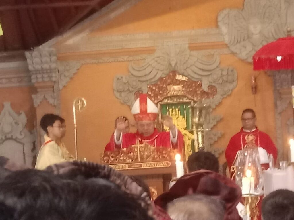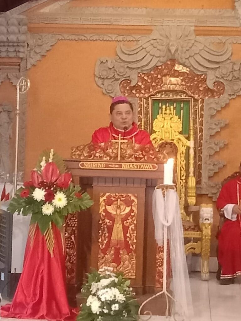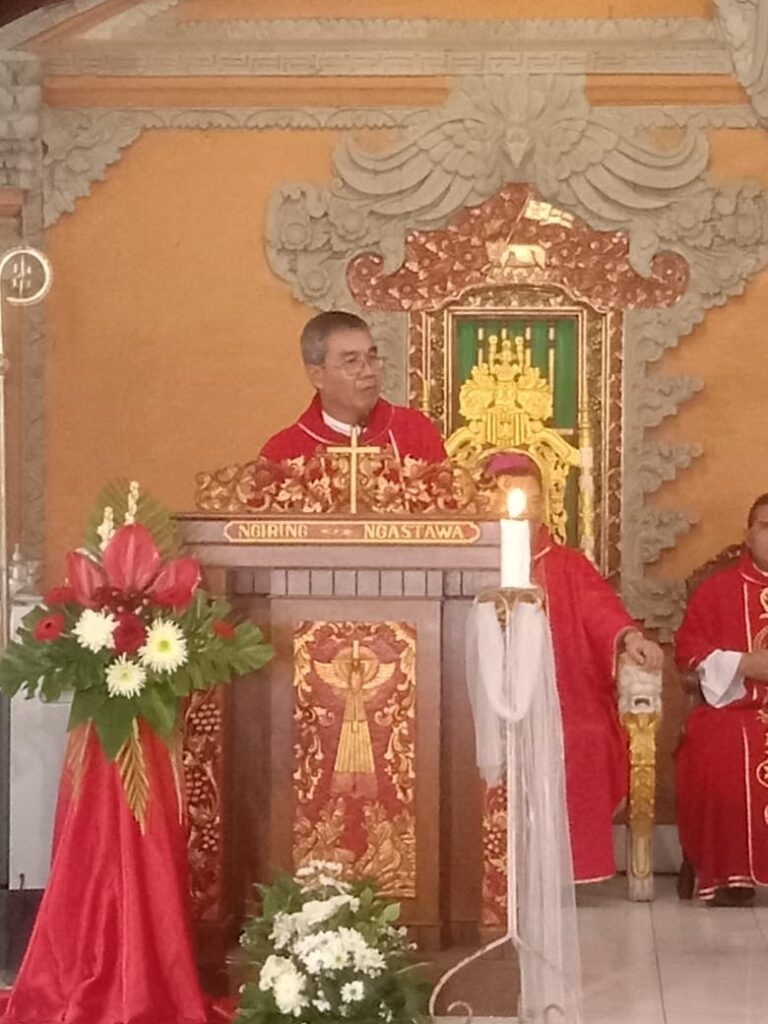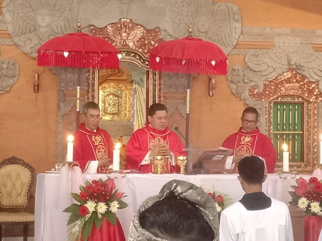 Mgr.Dr.Silvester San didampingi RP.Paskalis I Nyoman Widarstra, SVD(Pastor Paroki Tuka) dan RP Gabriel Madja,SVD(Pastor Rekan) saat memimpin Misa Pelantikan DPP, DKP dan Prodiakon Paroki Tuka.