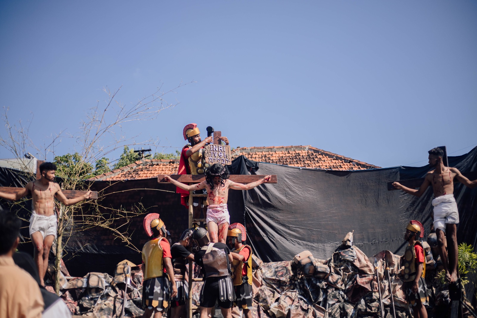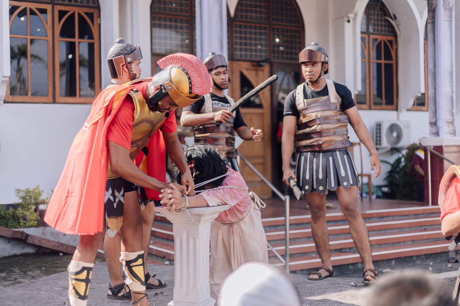 Sebelum puncak ibadah Jumat Agung (3/4/2026) yang dilaksanakan pada pukul 15.00 WITA, umat terlebih dahulu disuguhkan dengan drama visualisasi kisah sengsara Yesus Kristus yang dibawakan oleh Orang Muda Katolik (OMK) Paroki Ampenan.